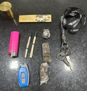 Durante a abordagem, foi encontrada em sua posse uma porção de substância análoga à maconha.