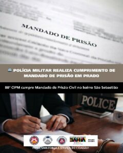 A Polícia Militar da Bahia, por meio da 88ª CIPM, realizou na tarde desta quinta-feira (16), por volta das 13h30, o cumprimento de mandado de prisão civil no bairro São Sebastião, em Prado.