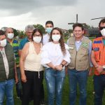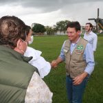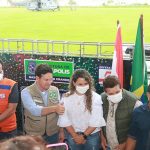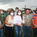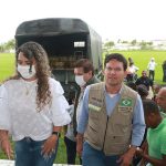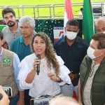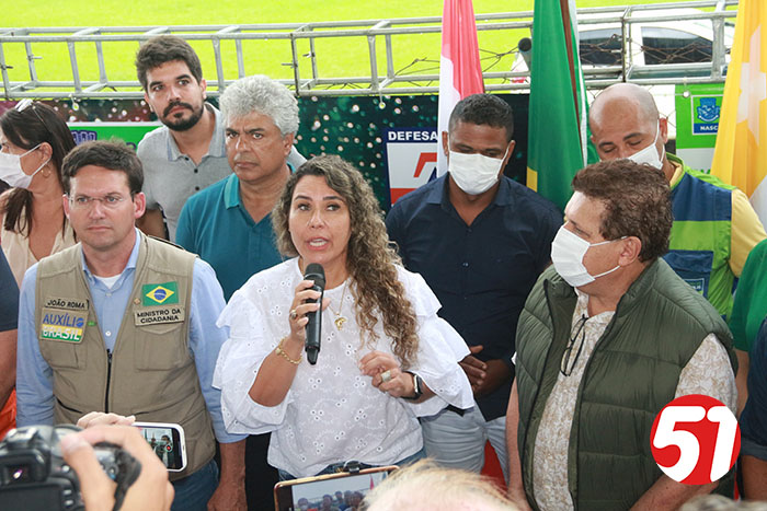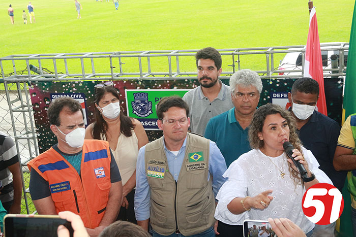 Depois a fortaleza voadora da marinha do Brasil 08 nº 7108, pousou e com isto, o evento tomou forma, e tudo saiu do jeito que estava determinado. Já no palanque improvisado, primeiro falou a 1ª dama e prefeita do município, Cordélia Torres, que agradeceu a boa vontade do ministro João Roma e que em tempos de tempestade, viu e ouviu a prefeita, quando esta fez um retrato do que está acontecendo na região e falou do auxílio enviado pelo Presidente Bolsonaro, para toda a região afetada pelas chuvas e fortes ventos, não só das cestas básicas enviadas, como do suporte financeiro enviado, sendo que para cada família, foi fixado um valor emergencial de 400 reais. A prefeita Cordélia falou tudo que tinha pra falar, como forma de explicitar o apoio não só do presidente Bolsonaro como também do ministro João Roma e seus assessores.