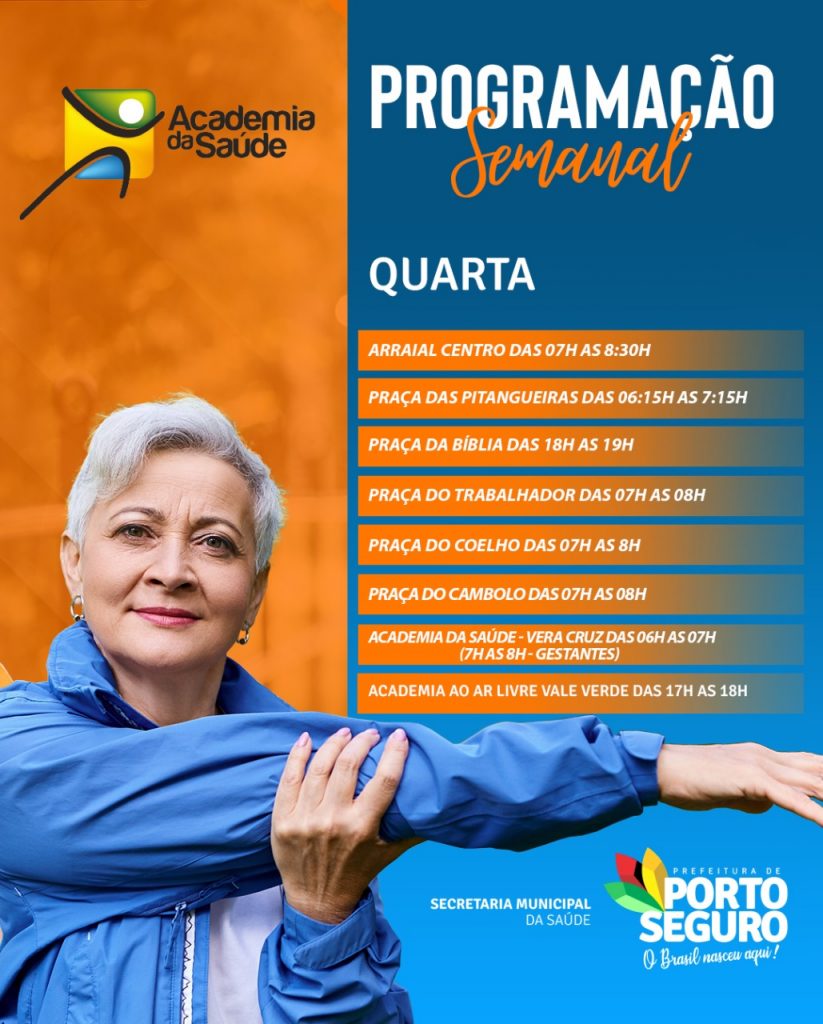 A Prefeitura de Porto Seguro, através da Secretaria Municipal da Saúde, preocupada com o bem-estar dos moradores da Terra Mãe do Brasil, organizou uma programação semanal de benefícios da atividade física cumprindo as medidas preventivas contra a covid-19.
