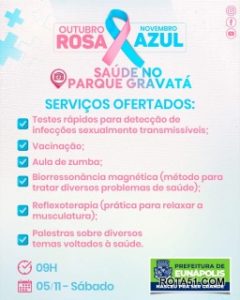 Como parte das ações das campanhas do Outubro Rosa e Novembro Azul, uma grande ação de saúde será realizada neste sábado (05), às 9h, no Parque Ecológico Gravatá. A iniciativa ofertará diversos serviços para a população com o intuito de prevenir os cânceres de próstata e mama, discutir a saúde mental e proporcionar atividades de lazer.