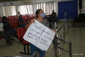 Nesse momento, o presidente da casa, solicitou que a professora se retirasse, so plenário, no que não foi obedecido, então Jorge Maécio, solicitou a presença da guarda municipal, para que a professora fosse retirada. Somente depois foi a sessão teve início e, pode continuar com a Ordem do dia. Se a professora entrou na justiça e ganhou a causa, seria na justiça o local da reclamação, depois que causa foi julgada e o MM juiz bateu o martelo, somente a justiça, poderá tomar a decisão judicial, a qual a causa foi prolatada, sendo que nada mais poderia ser feito em torno do problema.