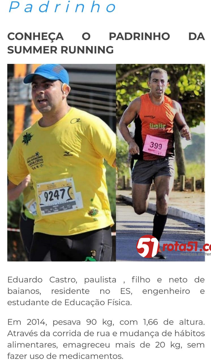 E como sempre faz, mais uma vez Milton Guerreiro, se fez presente e chegou em 3º lugar e, não é a 1ª vez que ele participa de corridas e maratonas, Milton já participou de várias maratonas de São Silvestre, corridas em Porto Seguro, e agora ao participar desta 1ª Summer Running, foi agraciado com a medalha de 3º Lugar a saber que Milton Guerreiro também é o diretor legislativo da CME de Eunápolis e sempre sobra um tempinho para suas corridas-treino pelas ruas da cidade.