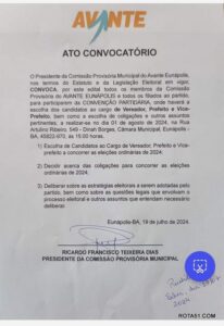 O Diretório Municipal do Avante anunciou a data da convenção que vai indicar, oficialmente, o ex-prefeito Neto Guerrieri e o empresário Kaká Resolve para concorrer aos cargos de prefeito e vice, respectivamente, na cidade de Eunápolis, na Costa do Descobrimento, com vistas às eleições municipais de 06 de outubro.