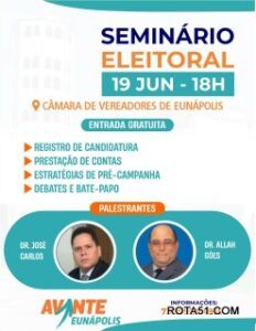 O Diretório local do Avante promove nesta quarta-feira, dia 19 de junho de 2024, um Seminário Eleitoral para os pré-candidatos a vereadores que compõem o arco de alianças para as eleições municipais deste ano (Avante, Podemos, Solidariedade, PL e PMB).