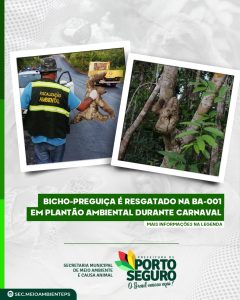 Durante rondas de plantão durante o Carnaval, equipe de fiscalização ambiental da Secretaria Municipal de Meio Ambiente e Causa Animal, se deparou com um bicho-preguiça às margens da BA-001, correndo risco de atropelamento enquanto tentava atravessar a via.