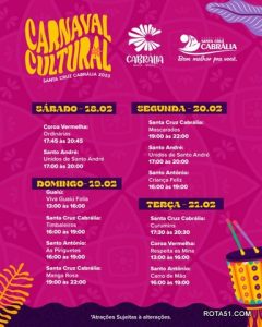 Ao todo, 11 blocos culturais estão na programação do Carnaval de Santa Cruz Cabrália, marcando as festividades com muita cultura, tradição, animação e confraternização entre moradores e visitantes que escolheram a cidade para curtir a festa de forma democrática e popular.
