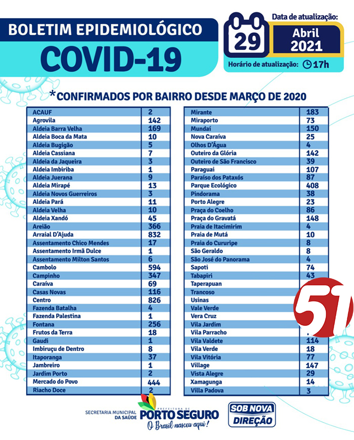 A Prefeitura de Porto Seguro, através da Secretaria Municipal de Saúde, informa que no período de 14/03/2020 a 29/04/2021, foram 18.391 casos de COVID-19, sendo 7.425 confirmados e 10.966 suspeitos, classificados de acordo com a sintomatologia clínica.