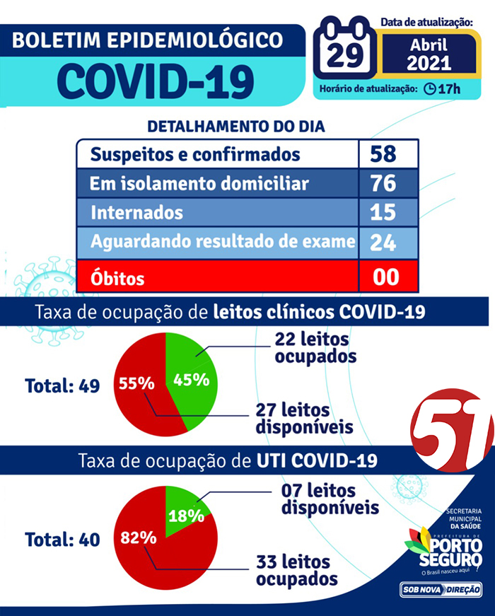 A Prefeitura de Porto Seguro, através da Secretaria Municipal de Saúde, informa que no período de 14/03/2020 a 29/04/2021, foram 18.391 casos de COVID-19, sendo 7.425 confirmados e 10.966 suspeitos, classificados de acordo com a sintomatologia clínica.
