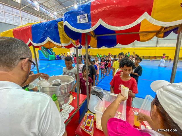 Além das atividades recreativas, não faltaram guloseimas para adoçar o paladar da criançada. Algodão doce e pipocas estavam à disposição, proporcionando uma experiência deliciosa e saborosa para os presentes.