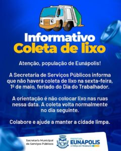 A Prefeitura de Eunápolis, por meio da Secretaria Municipal de Serviços Públicos, informa que não haverá coleta de lixo na sexta-feira, 1º de maio, em razão do feriado do Dia do Trabalhador. A orientação é que a população não coloque resíduos nas ruas nesta data, contribuindo para a limpeza e organização da cidade. O serviço será retomado normalmente no sábado (2).