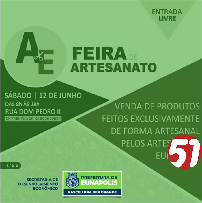 A realização do evento é do grupo de artesãos de Eunápolis, que está contando com o apoio da Prefeitura de Eunápolis, através da Secretaria Municipal de Desenvolvimento Econômico. Na feira estará sendo apresentados vários tipos de peças artesanais, todas confeccionadas em Eunápolis, inclusive a parte de alimentação, com comidas típicas e outras guloseimas.