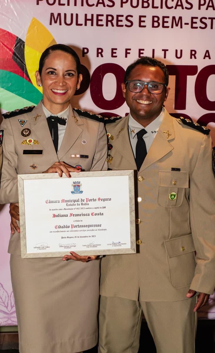 Na noite da última segunda-feira, 1° de dezembro, a Capitã PM Juliana Francisca Costa, pertencente ao 8° Batalhão de Polícia Militar, foi agraciada com o Título de Cidadã Portossegurense por sua atuação notória no combate à violência doméstica em Porto Seguro. O evento foi realizado no auditório do Hotel Eco Bahia e contou com a presença de diversas autoridades e personalidades, dentre as quais se destacam as demais homenageadas: a Sra. Nágila Maria Sales Brito, Desembargadora do TJBA; a Sra. Sara Gama Sampaio, Promotora de Justiça; a Sra. Fernanda Silva Lordello, Secretária Municipal de Políticas para Mulheres de Salvador; a Dra. Michelle Quadros Patrício, Juíza da 2ª Vara Crime de Porto Seguro; e a Sra. Rosângela Santos de Sousa, Delegada Titular da DEAM.