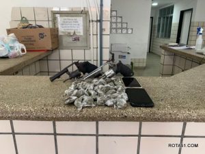 Os homens estavam a bordo de um veículo Ônix de cor branca, fazendo entrega de drogas na cidade. Após receberem informações sobre a atividade criminosa, os policiais em rondas identificaram o veículo e passaram a acompanhá-lo.