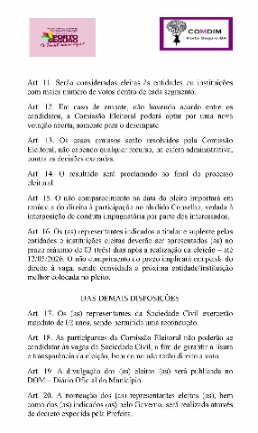 Os representantes da Sociedade Civil exercerão mandato de 02 anos, sendo permitida uma recondução. A divulgação dos eleitos será publicada no Diário Oficial do Município.