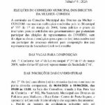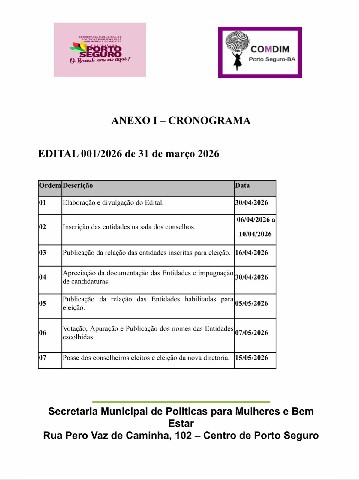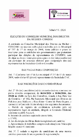 Estão abertas, até o dia 10 de abril, as inscrições para as entidades não governamentais interessadas em participar das eleições de representantes do COMDIM (Conselho Municipal dos Direitos da Mulher). Os pretendentes a uma cadeira no conselho deverão comparecer Secretaria Municipal dos Direitos de Políticas para Mulheres e Bem Estar, situada à Rua Pero Vaz de Caminha, nº 102, apresentando à Comissão Eleitoral cópia dos documentos exigidos.
