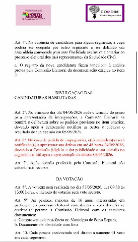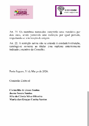 A votação dos novos membros será realizada no dia 07/05, das 09:00 às 13:00 horas, por meio de voto secreto. Para participar, os interessados, maiores de 16 anos, deverão se credenciar junto à Comissão Eleitoral com os seguintes documentos: Comprovante de Residência no Município de Porto Seguro e Documento de Identidade, com foto.