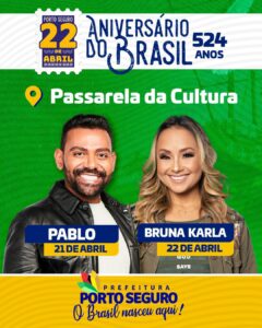 A festa contará com a cantora Bruna Karla, no dia 22 de abril, quando se festeja o marco da chegada dos portugueses ao país. A carismática, Bruna Karla já gravou 10 álbuns de estúdio, 2 DVDs e três EPs (sendo um em espanhol). Com 22 anos de carreira e cinco indicações ao Grammy Latino, ela é um dos maiores nomes da música gospel brasileira na atualidade. Ela, que é a intérprete de hits como “Cicatrizes”, “Lugar Santo”, “Sou Humano” e “Advogado Fiel” tem milhões de execuções nas plataformas digitais e contabiliza mais de 380 mil plays somente com o novo single, “O Grande Eu Sou”, promete envolver o público com canções cheias de inspiração.