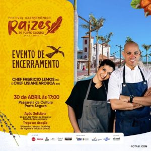 Participe dos dois últimos eventos da 3ª Edição do Festival Gastronômico Raízes em Porto Seguro. No dia 29/04 haverá a Escola Gastronômica com aulas com o chef Uelcimar Cerqueira, workshop de drinks com o Instrutor de Hotelaria Joaldo Farias, e cozinha kids com o chef João Tozatto, além da ‘feirinha de produtos agroalimentares regionais’ e presença de empreendimentos do Roteiros do Brasil Rural. No dia 30/04 será o encerramento com os chefs Fabrício Lemos e Lisiane Arouca, com uma feirinha de alguns dos restaurantes participantes do Raízes.