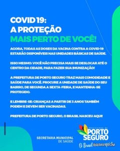 A Prefeitura de Porto Seguro traz mais comodidade e saúde para você. Procure a unidade de saúde do seu bairro, de segunda a sexta-feira, e mantenha-se protegido.