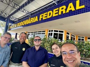 Na manhã da terça-feira (26), a Polícia Rodoviária Federal realizou um encontro para promover a integração entre forças policiais em Vitória da Conquista (BA). Nas dependências da Delegacia 06, foram recebidos o Coordenador Regional da Polícia Civil (PC), Dr. Fabiano Santos Aurich, o Delegado e Vereador Dr. Marcus Vinícius de Morais Oliveira e o Policial Militar (PM) SD Marcos Antônio Piloto, da 80ª Cia da PM de Cândido Sales (BA).