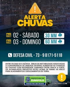 Em caso de necessidade, a Defesa Civil de Eunápolis está disponível 24 horas e pode ser acionada pelo número 739 8171-5118.