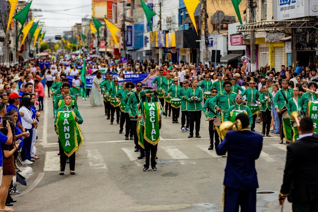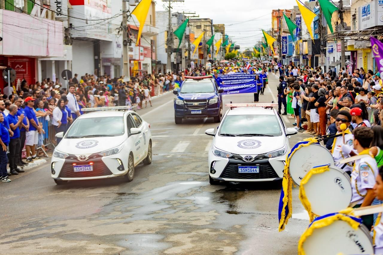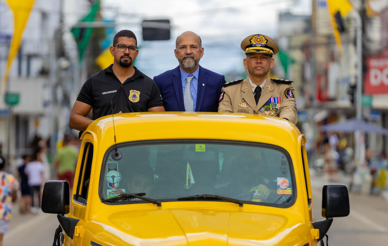 No palanque oficial, instalado na Praça da Bandeira, o prefeito Robério Oliveira acompanhou o evento ao lado da primeira-dama e deputada estadual Cláudia Oliveira, do vice-prefeito Pastor Bené, do presidente da Câmara, Valdiran Marques, além de vereadores, secretários municipais e representantes das forças de segurança, autoridades civis e religiosas.