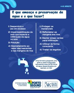 🌊Mas, ao mesmo tempo, não podemos deixar de frisar que a água doce e potável do planeta pode se esgotar. São muitas as ameaças a esse recurso, como poluição, desperdício e uso em excesso, desmatamento das margens dos rios e vegetação ao redor de nascentes, além da poluição, seja por esgoto ou resíduos sólidos. Por isso, evite o desperdício, preserve a vegetação nas margens de rios e nas cidades, trate os esgotos e não descarte o lixo em local inadequado. Lembre-se, sem água, não há vida. Preserve-a!😉