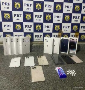 A Polícia Rodoviária Federal (PRF), na manhã dessa quinta-feira (28), apreendeu 16 celulares da marca iPhone 14 Pro Max de alto valor no mercado.