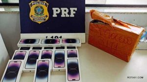 A Polícia Rodoviária Federal (PRF), na manhã dessa quinta-feira (28), apreendeu 16 celulares da marca iPhone 14 Pro Max de alto valor no mercado.