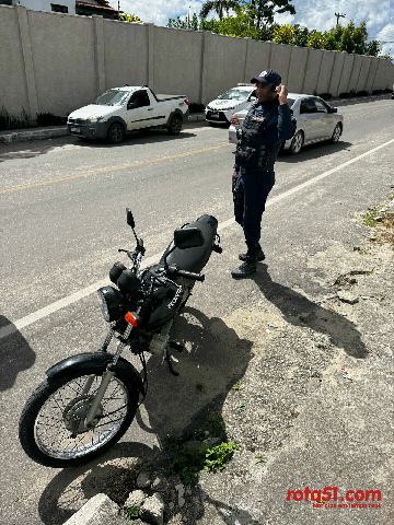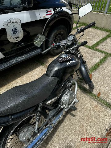 Ao se deslocarem para o local indicado, a guarnição localizou a motocicleta, mas o indivíduo em questão já havia abandonado o local. Após averiguação da placa do veículo, foi constatado que a moto era produto de furto, registrada como roubada.