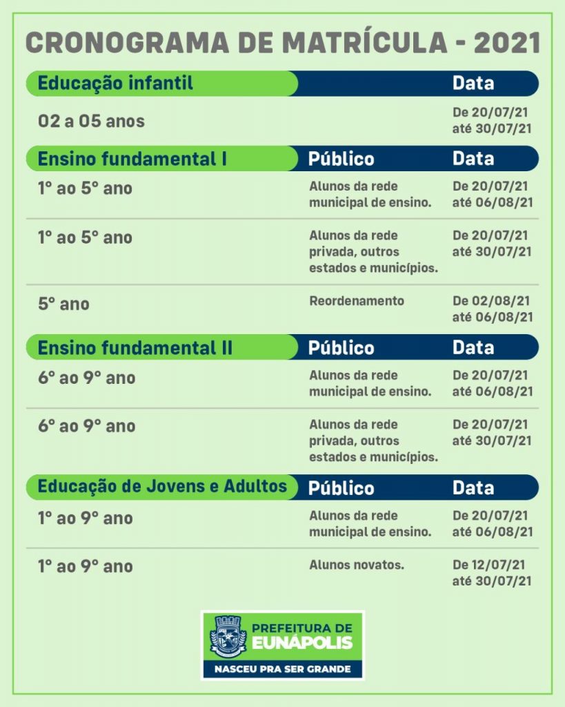 A Secretaria de Educação de Eunápolis informa a abertura das matrículas para o ano letivo 2021. Educação infantil, ensino fundamental I e II, e Educação de Jovens e Adultos são as modalidades ofertadas pela rede de ensino pública municipal.