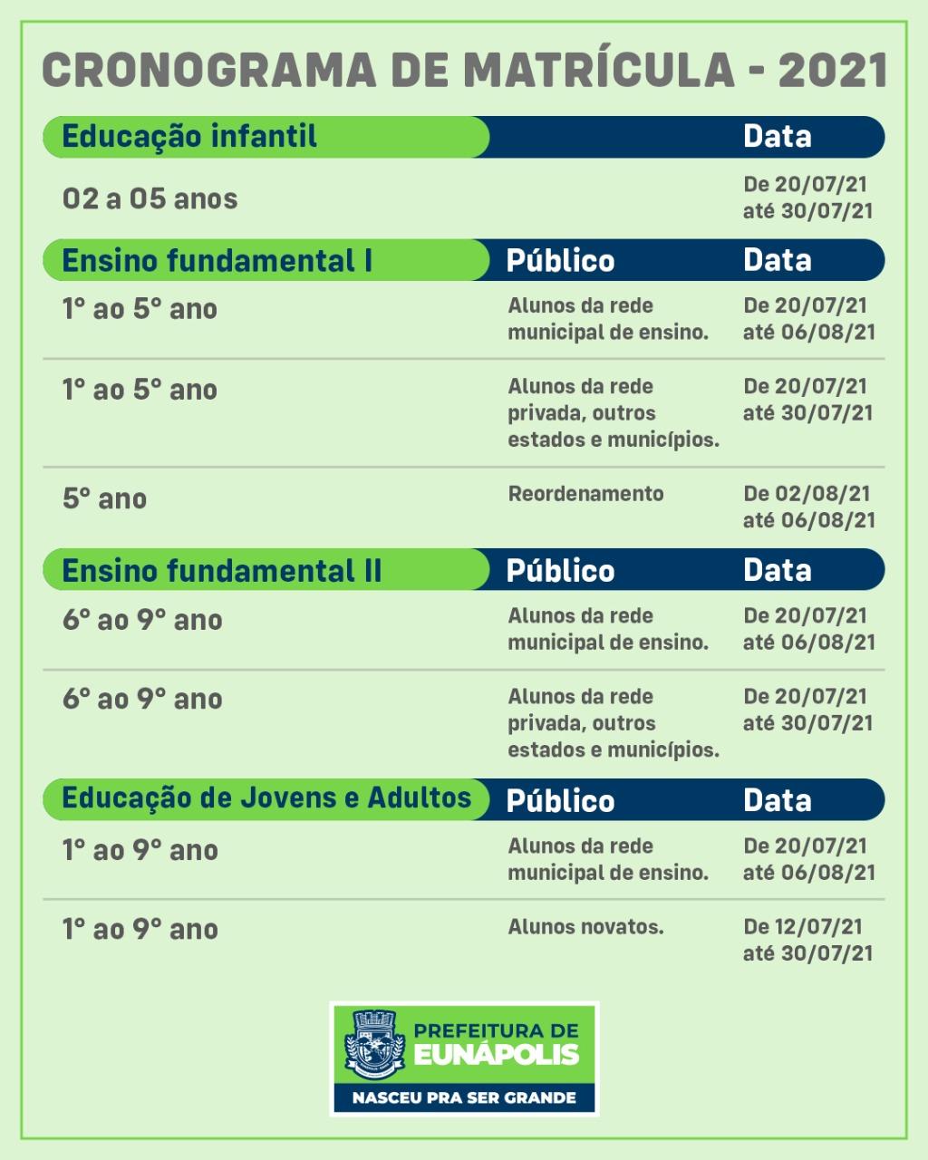 Foto 1: Cronograma de matrículas para o ano letivo 2021 em Eunápolis