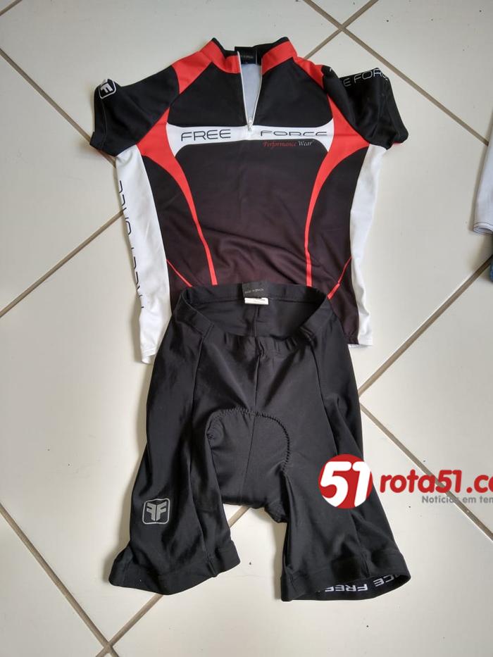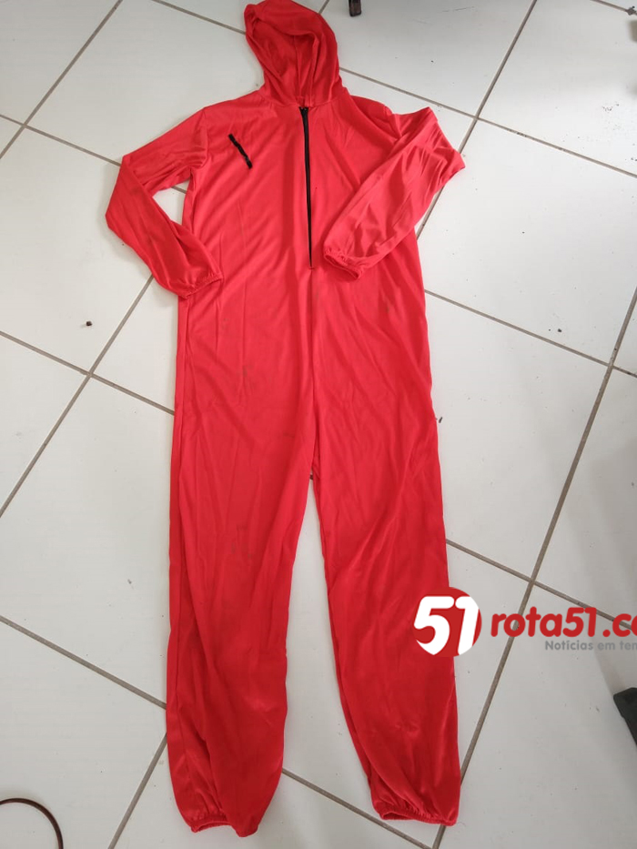 SEIS PETECAS DE COCAÍNA; UMA MOTOCICLETA usada em roubos; BRUCUTU; MACACÃO VERMELHO FANTASIA LA CASA DE PAPEL, usado durante os assaltos; e uma PISTOLA 380.