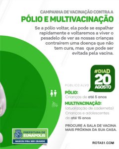 A Secretaria de Saúde de Eunápolis aderiu, na segunda-feira (08), à Campanha Nacional de Vacinação contra Poliomielite e Multivacinação 2022, promovida pelo Ministério da Saúde. A imunização, que segue até 09 de setembro, tem como objetivo ampliar a vacinação entre crianças e adolescentes menores de 15 anos. Já a intensificação da campanha e mobilização nacional ocorrerá no dia 20 deste mês.