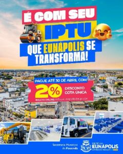 A Prefeitura de Eunápolis informa que o prazo para pagamento do IPTU 2026 com 20% de desconto em cota única se encerra nesta quinta-feira (30). A medida representa uma oportunidade para que os contribuintes regularizem o imposto com condições facilitadas, garantindo economia e contribuindo com o desenvolvimento do município.