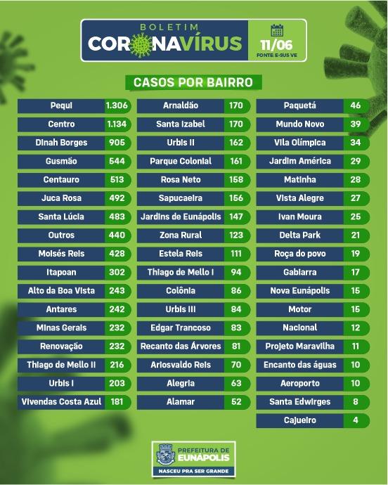 BOLETIM CORONAVÍRUS – 11/06 É com grande pesar que informamos a confirmação de mais 2 óbitos. O município tem hoje 10.437 pacientes confirmados com o novo coronavírus, sendo 10.045 já recuperados, 218 ativos (casos confirmados subtraídos os óbitos e os recuperados) e 174 óbitos. O município segue com 09 óbitos sob investigação.