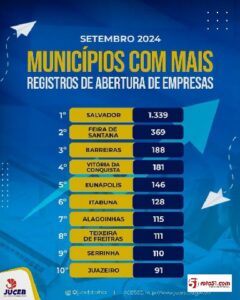 A cidade de Eunápolis continua se destacando no cenário econômico da Bahia, ocupando a quinta posição entre os municípios com mais registros de abertura de empresas no mês de setembro de 2024, conforme dados da Junta Comercial do Estado da Bahia (JUCEB). Com 146 novos empreendimentos, Eunápolis superou importantes polos regionais como Itabuna, Teixeira de Freitas e Juazeiro. Esse avanço reflete o crescimento da confiança de investidores e empreendedores na economia local.
