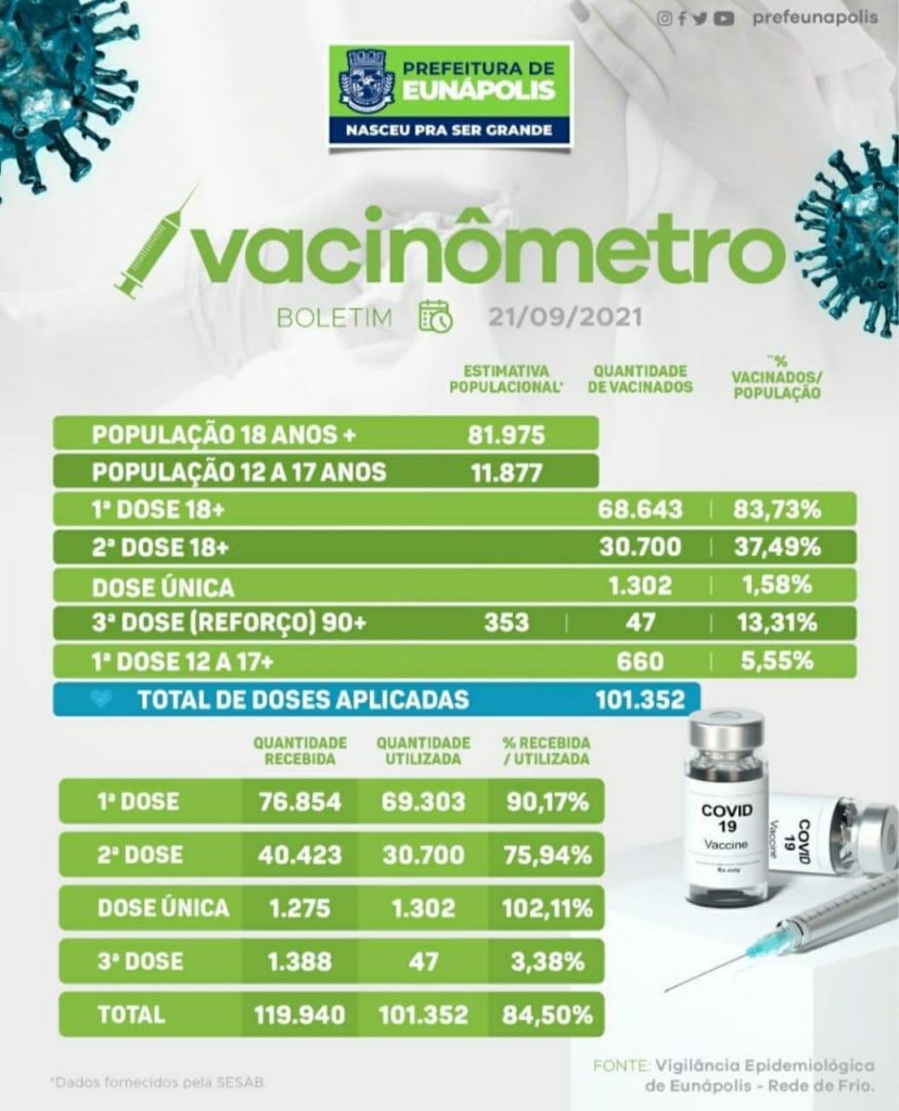 Esse quantitativo representa mais de 90% de aplicação de pelo menos a primeira dose da vacina contra a Covid-19, o que demonstra a agilidade e eficiência da gestão pública na oferta de serviços de saúde de excelência para a população eunapolitana.