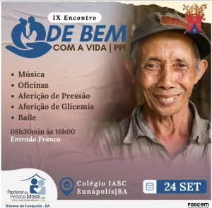 E com o mote do evento “De bem com a vida”, o assunto da pessoa idosa é de suma importância ser tratado com o seu devido valor e notoriedade. O Papa São João Paulo II, declarou que “cada comunidade acompanhe com compreensão amorosa todos que envelhecem”. E dentro desta premissa esse assunto deve ser abordado com toda a atenção e cuidado, pois estamos tratando de valorizar nosso passado e criando solidez para o nosso futuro como sociedade ao cuidar da pessoa idosa.