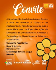 Nesta quarta-feira, 18 de maio, toda a comunidade está convidada a participar das ações da Campanha de Enfrentamento e Combate à Exploração e ao Abuso Sexual de Crianças e Adolescentes. Será a partir das 9h, na Praça da Caixa D’Água, no Baianão, em uma importante iniciativa da Prefeitura de Porto Seguro, por meio da Secretaria Municipal de Assistência Social e da Rede de Proteção à Criança e ao Adolescente.