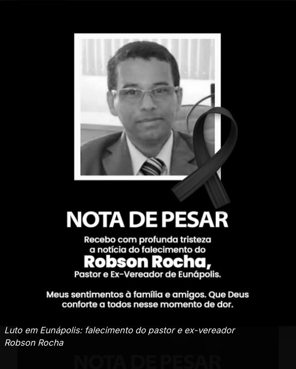 Depois de sofrer um acidente, o ex vereador Robson Rocha, foi submetido a uma cirurgia em Porto Seguro, e depois foi internado no HRE em Eunápolis, ainda em decorrência a um acidente, ROBSON ROCHA, veio a óbito na tarde desta segunda feira dia 20/10.