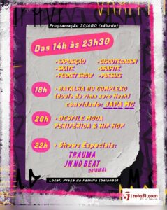 O coletivo Zero Flash, idealizador do evento, busca ampliar a difusão da cultura hip hop na área 073, criando conexões entre artistas e comunidade. “A programação musical inclui shows de peso como Trauma e JN no Beat, além de apresentações de rap, pocket shows e discotecagem, costurando um roteiro que mistura arte, performance e convivência”, detalha o coordenador, Paulo Purusha.