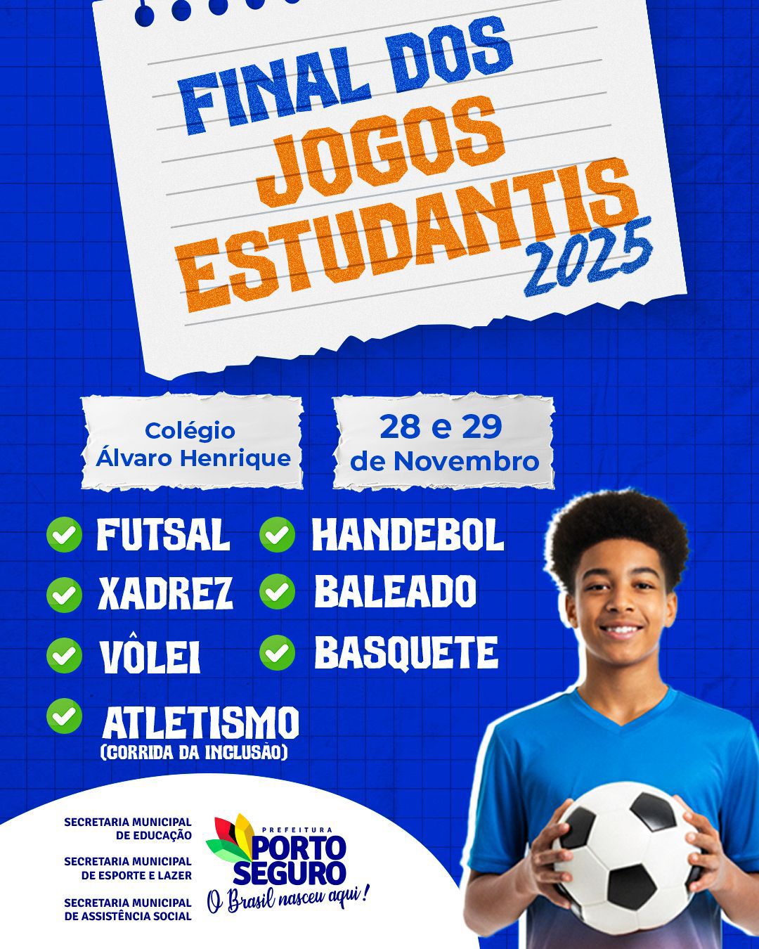 Uma grande festa do esporte será realizada nos dias 28 e 29 de novembro, com a final dos Jogos Estudantis de Porto Seguro. Mais de 70 equipes estão inscritas para as finais, que serão disputadas nas quadras da Praça da Família, Colégio Álvaro Henrique e Cantinho da Paz, no Complexo Baianão. Ao todo, mais de 4000 alunos estão participando de toda essa estrutura dos Jogos Estudantis, que estão sendo resgatados, após 12 anos suspensos.
