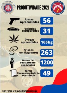 Durante todo o ano de 2021, a 7ª CIPM realizou, através de ações conjuntas e integradas, a recuperação de 31 veículos, apreensão de 56 armas de fogo, 165 quilos entorpecentes. Também realizou 49 Termos Circunstanciados de Ocorrência e 263 prisões em flagrante e cumpriu 1200 Ordens de Policiamento.