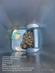 Após chamado para captura de uma cobra jiboia, localizada no Alto de Pitinga, em Arraial d’Ajuda, na quinta-feira, 25, agentes da Fiscalização Ambiental de Porto Seguro se deslocaram até o local e procederam com a captura do animal, de forma segura a garantir sua integridade e a levaram para o CETAS, onde passa por observação de veterinário e logo, será reinserida em área de floresta.