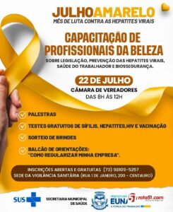 Como parte das ações do “julho Amarelo” — mês de conscientização e combate às hepatites virais — a Prefeitura de Eunápolis, por meio da Secretaria Municipal de Saúde, realiza, no dia 22 de julho, capacitação voltada exclusivamente para profissionais da área da beleza, como manicures, pedicures, podólogos, cabeleireiros, tatuadores, esteticistas e demais trabalhadores do setor. O evento acontecerá na Câmara de Vereadores de Eunápolis, na Rua Artulino Ribeiro, nº 549, bairro Dinah Borges, das 8h às 12h.