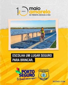 Dando início às ações do movimento nacional “maio Amarelo”, a Prefeitura de Porto Seguro, através da Portran, está promovendo um ciclo de palestras educativas em diversas instituições de ensino do município, do dia 08 a 17 de maio, para os alunos do Ensino Médio (15 a 17 anos). Estão previstas, ainda, ações com profissionais da classe de transporte. O objetivo é trabalhar a conscientização para um trânsito mais seguro e prevenção de acidentes.