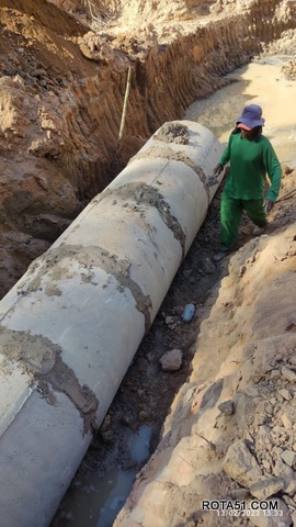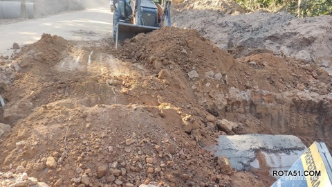 Um novo sistema de tubulações para drenagem está sendo instalado para facilitar o escoamento das águas, especialmente nos períodos mais chuvosos, garantindo a trafegabilidade no local.