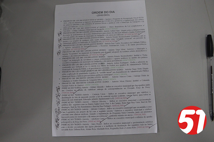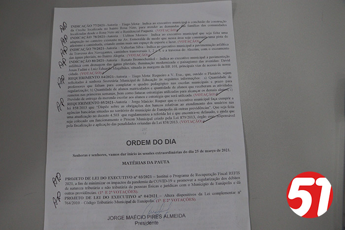 Todas as indicações e projetos colocados para a votação nesta sessão foram aprovadas, inclusive em sessões extraordinárias, em 1ª e 2ª votações, o programa de recuperação FISCAL REFIS, para minimizar o impacto financeiro causado pela Covid 19.